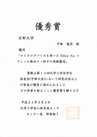 The SCEJ 14th Students Meeting awarded the following four undergraduate students for excellent presentations on March 3, 2012 in Ube, Yamaguchi, Japan:
