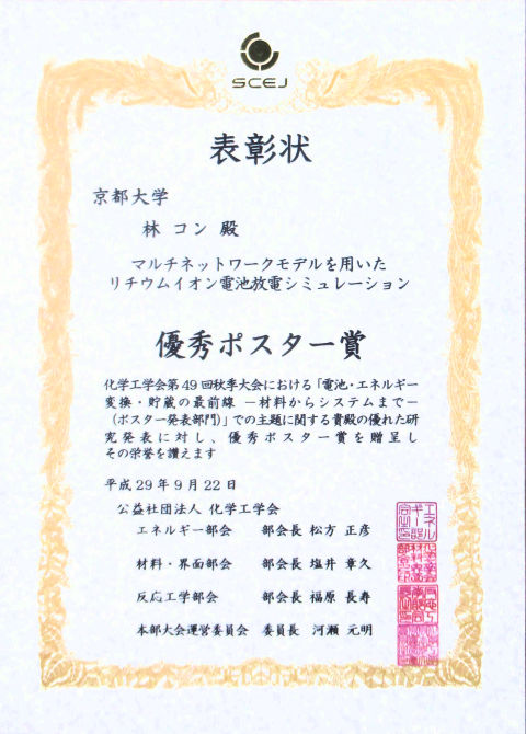 Symposium <Recent Advances in Batteries, Solar Cells, Fuel Cells, Energy Carriers and Other Energy Conversion Technologies from Materials to Systems> (Poster Session) held in the 49th SCEJ Autumn Meeting awarded Mr. Lin, Kun (M2, CRE) for the Distinguished Poster Presentation Award on September 22nd, 2017.