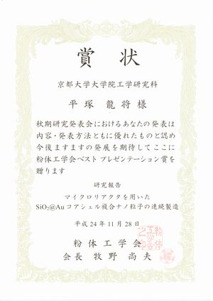 2012年度粉体工学会秋期研究発表会(11月27ー28日,東京)にて修士2回生 白石昇平君(粉体工学研究室),修士1回生 平塚龍将君(界面制御工学研究室)の2名がBest Presentation賞を受賞しました。