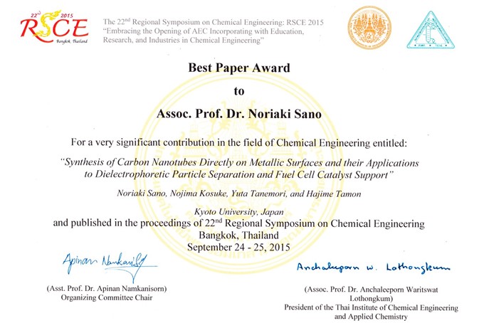 タイのバンコクで開催された第22回Regional Symposium on Chemical Engineering (RSCE 2015, 2015年9月24~25日、バンコク)において、9月25日、佐野紀彰准教授らがBest Paper賞を受賞しました。