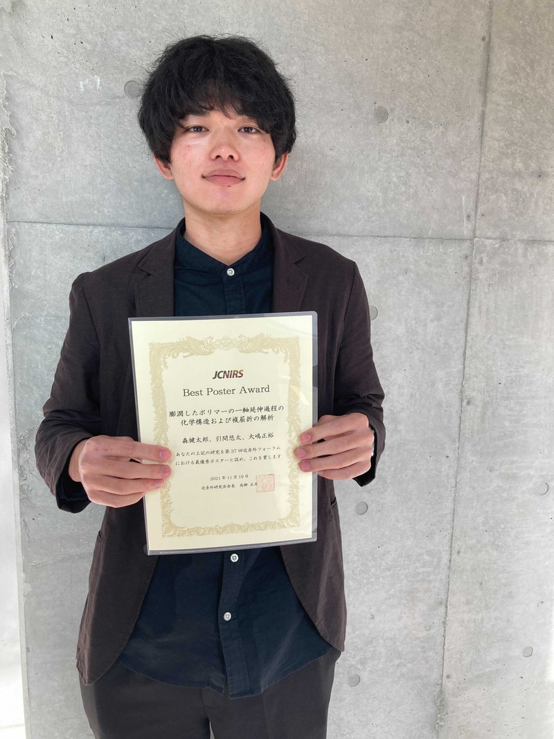 第37回近赤外フォーラム Best Poster Award受賞(M2 森) https://www.ch.t.kyoto-u.ac.jp/ja/news-events/news/2021_NIRf_Mori https://www.ch.t.kyoto-u.ac.jp/ja/news-events/news/2021_NIRf_Mori/@@images/image-1200-c4482a8b9e7e27c819ae9895b7b5a4f5.jpeg 第37回近赤外フォーラム Best Poster Award受賞(M2 森) 第37回近赤外フォーラム(2021年11月17日-19日,オンライン開催)において修士2回生 森健太郎君(材料プロセス工学研究室)がBest Poster Awardを受賞しました. 講演題目:膨潤したポリマーの一軸延伸過程の化学構造および複屈折の解析 ○森 健太郎・引間 悠太・大嶋 正裕 2021年11月19日