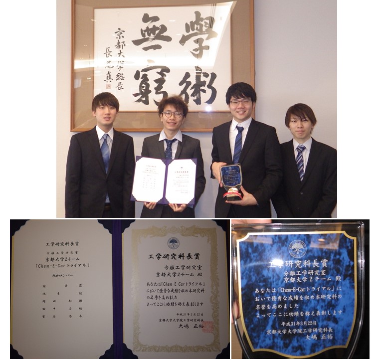 分離工学研究室の謝豪霆君(M1),池本陸君(4回生)、岡田知樹君(4回生)、田中志穂さん(4回生)、室谷尚吾君(4回生)が平成30年度工学研究科長賞を受賞しました。化学工学会第50回秋季大会にて行われたケムイーカートライアル(鹿児島大学、9月17日)に「京都大学2チーム」として出場し、優勝したことが受賞対象となりました。